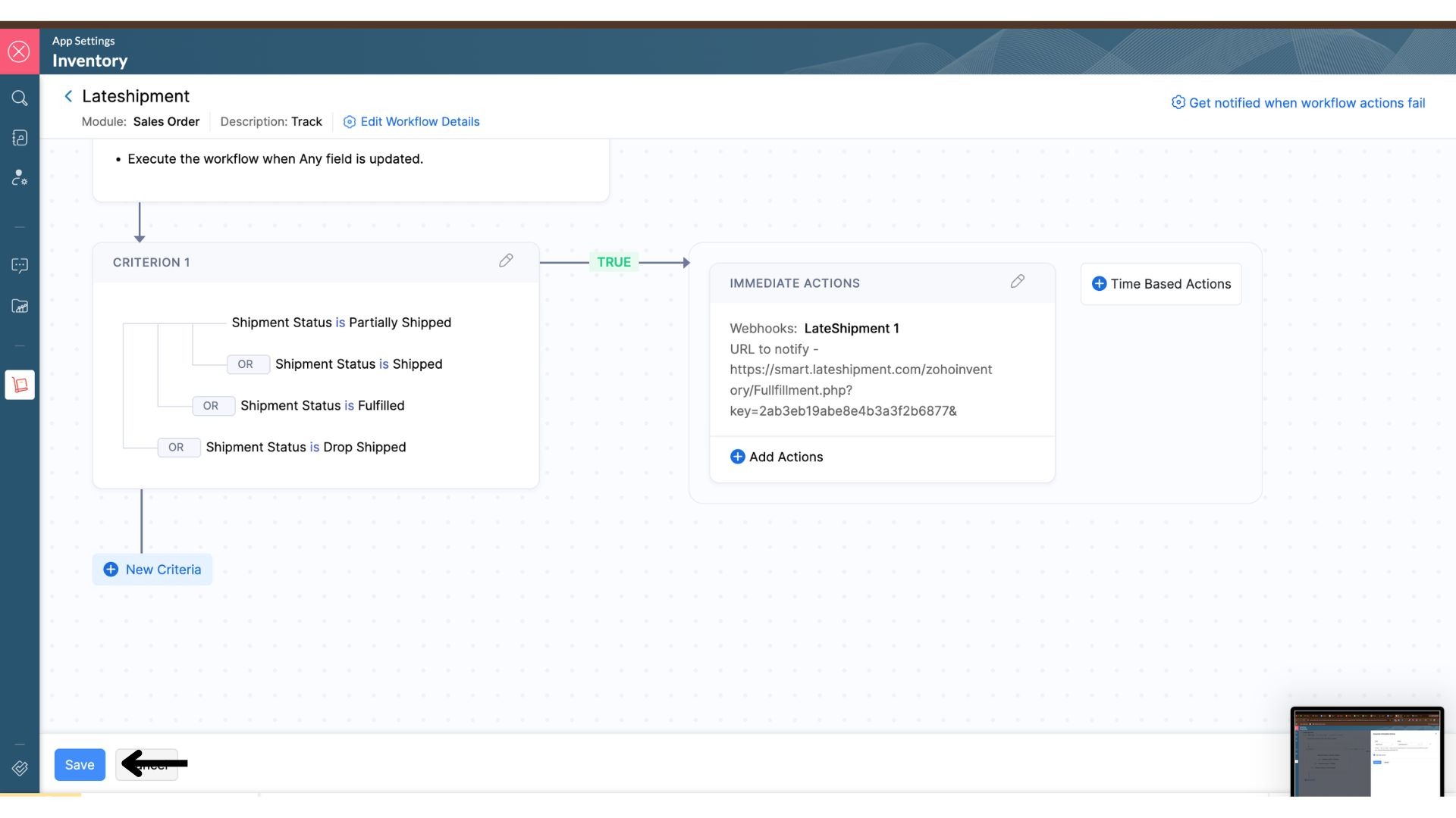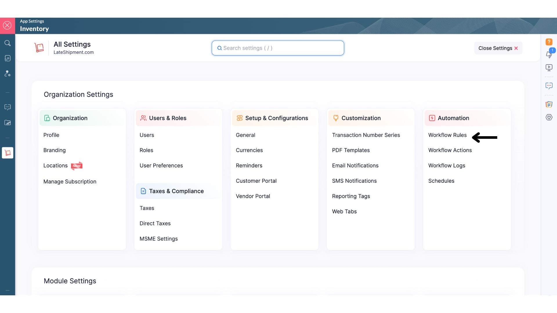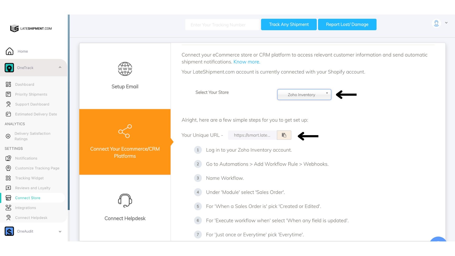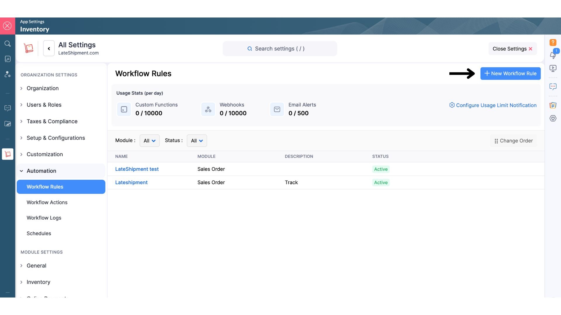This guide explains how to connect your Zoho Inventory account with LateShipment.com using a workflow rule and webhook. Once configured, shipment updates from Zoho Inventory will automatically be pushed to LateShipment.com for monitoring delivery performance and shipment events.
