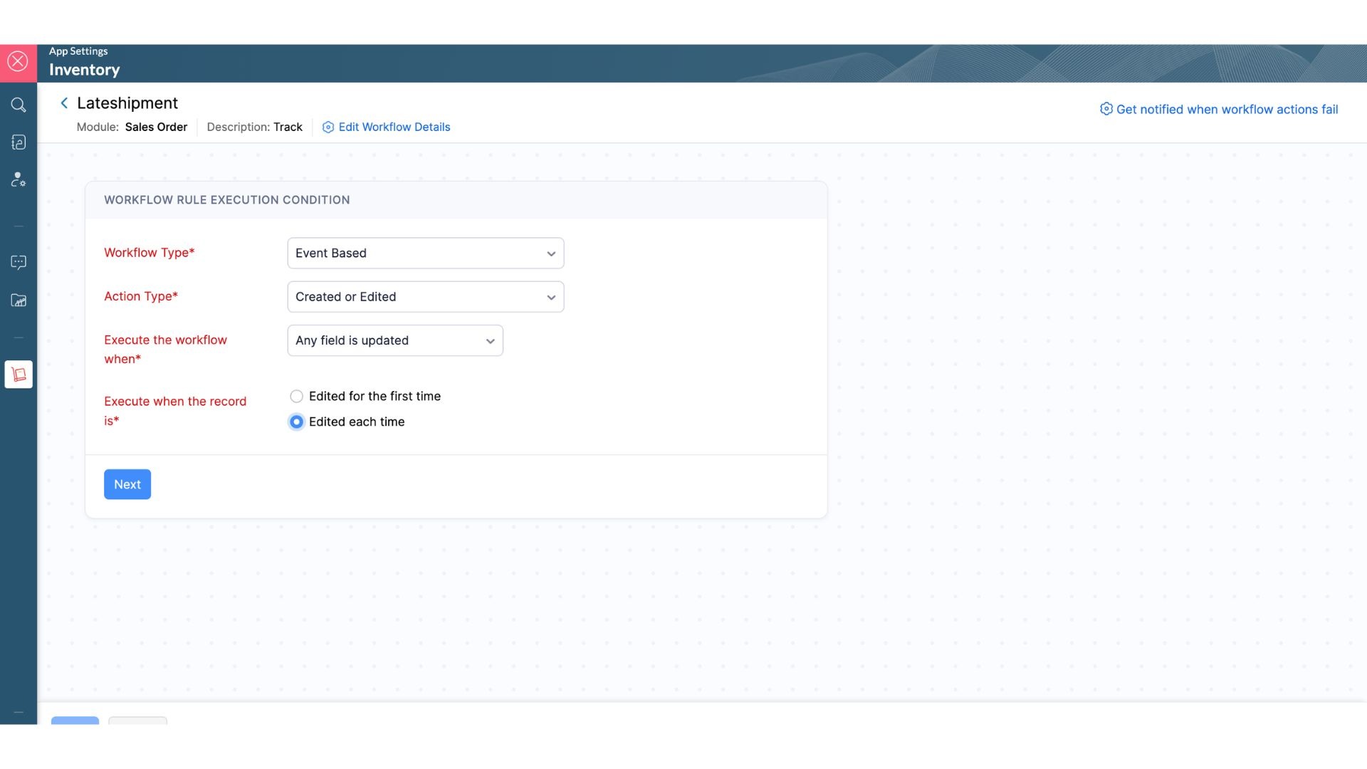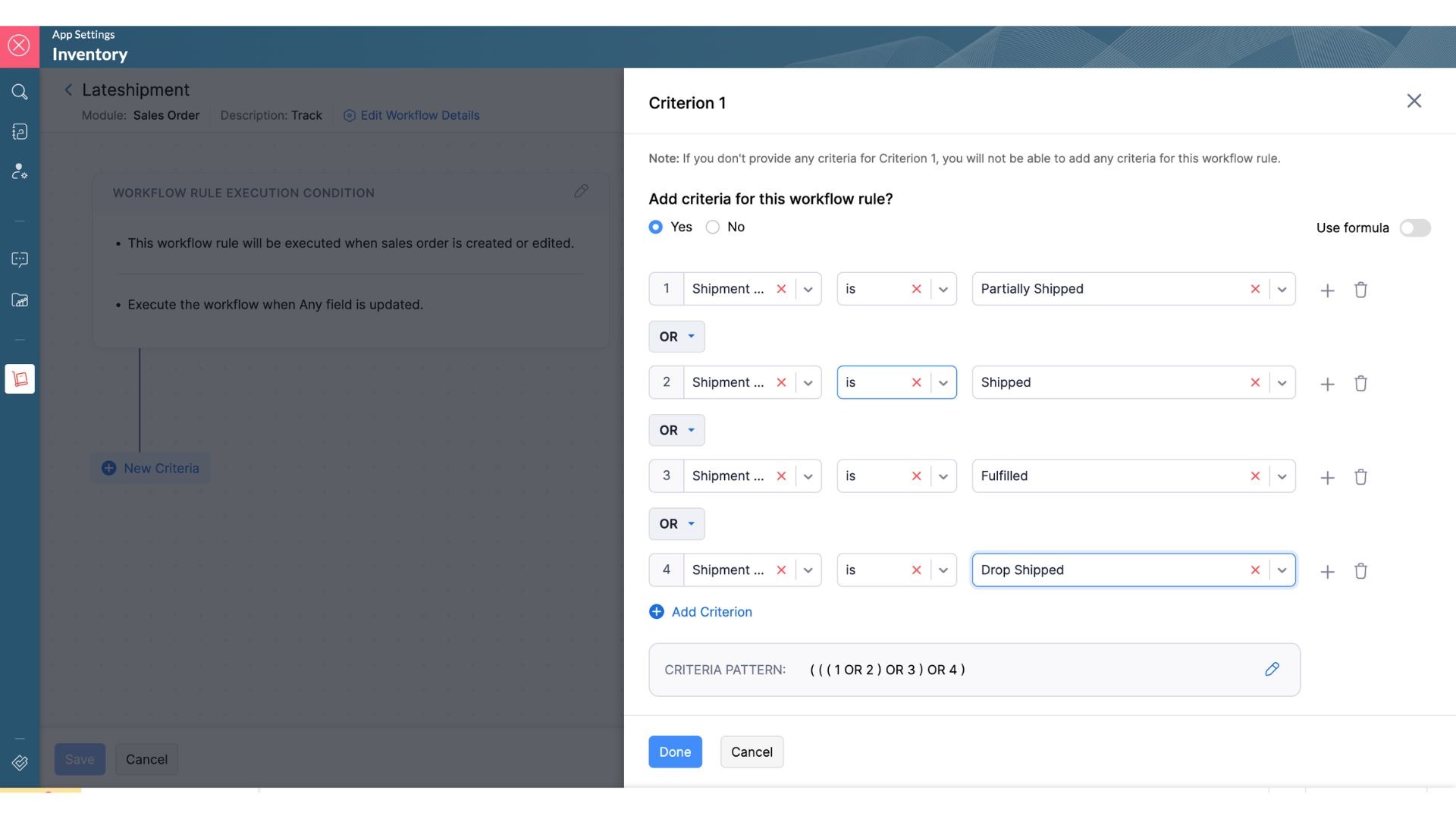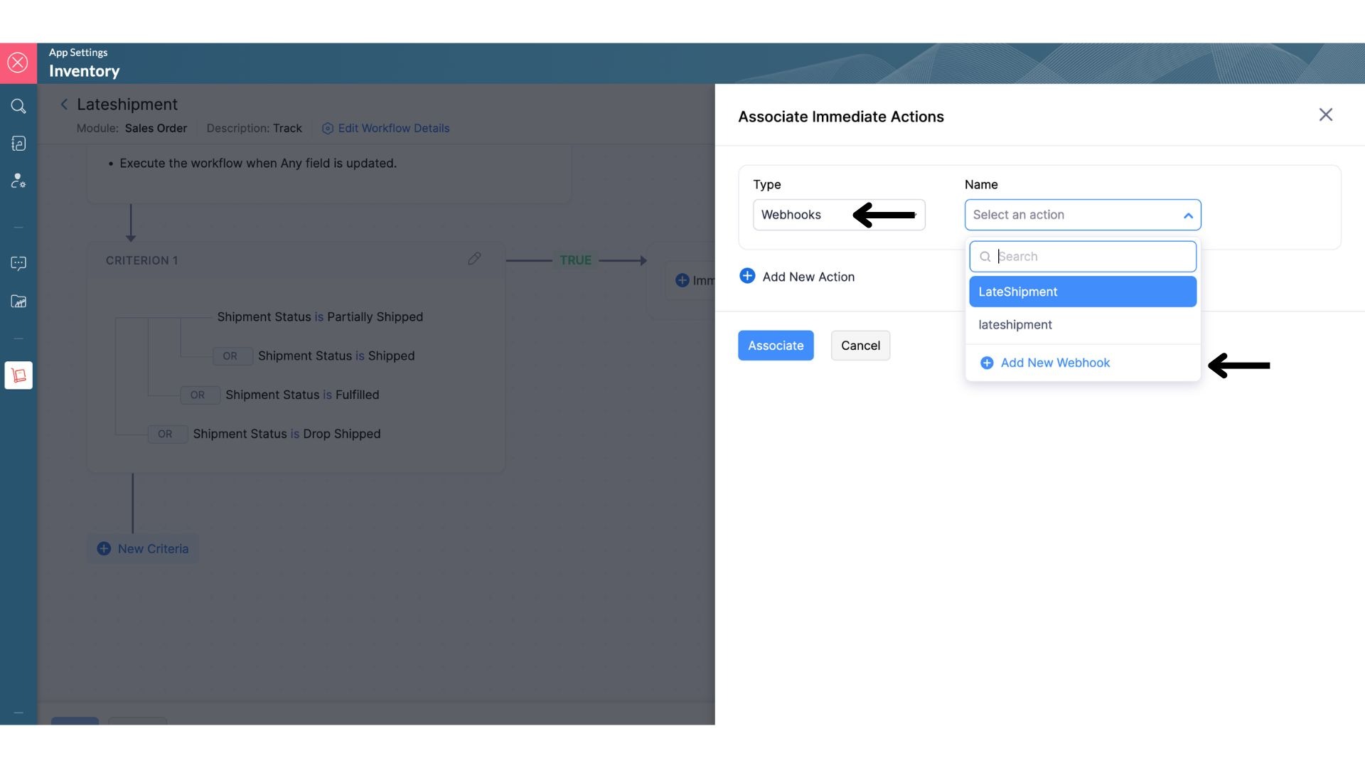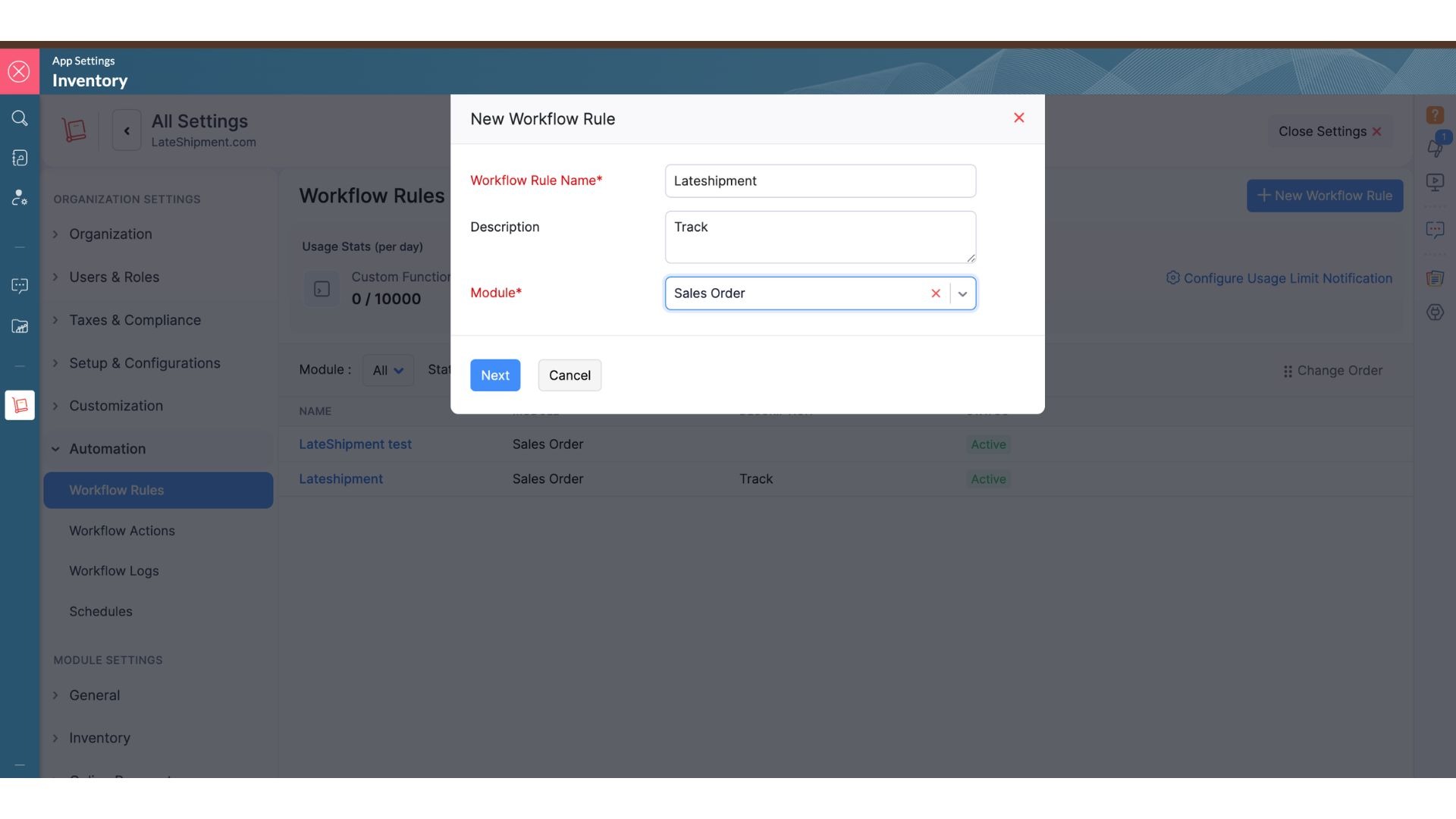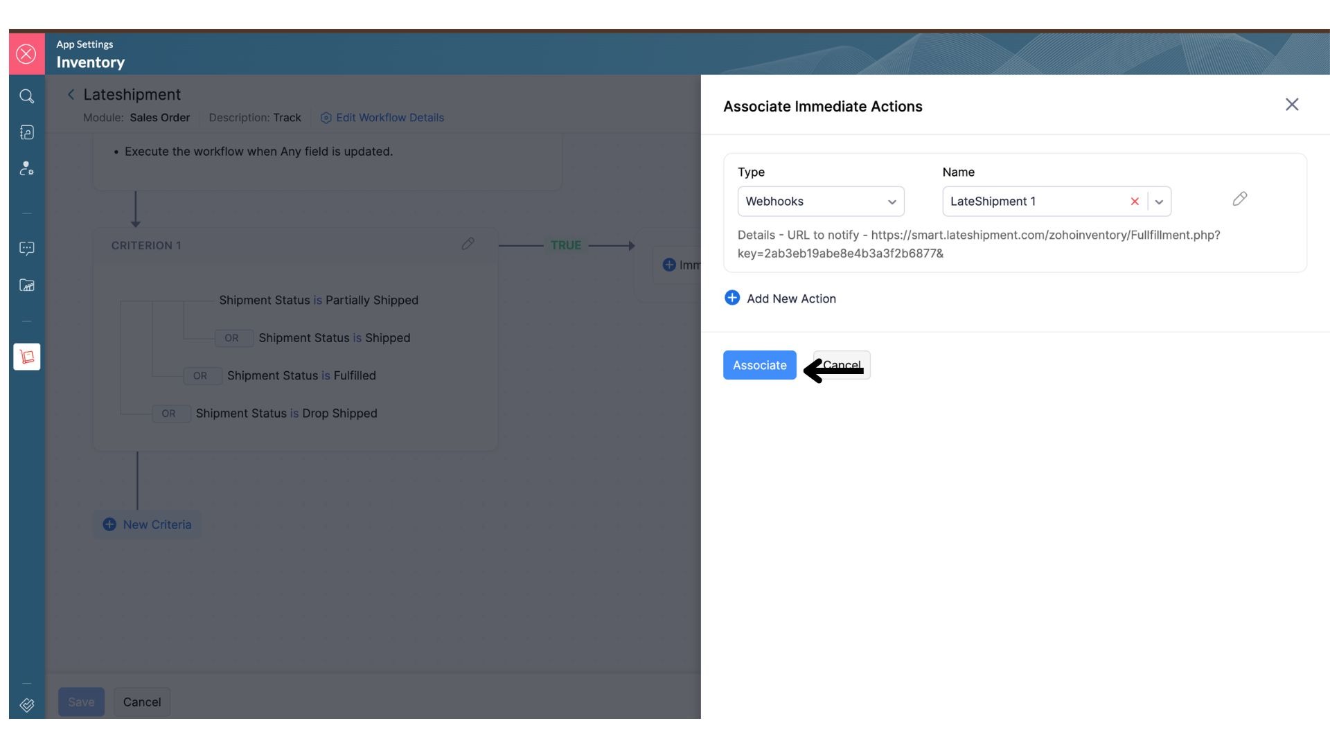 This guide explains how to connect your Zoho Inventory account with LateShipment.com using a workflow rule and webhook. Once configured, shipment updates from Zoho Inventory will automatically be pushed to LateShipment.com for monitoring delivery performance and shipment events.