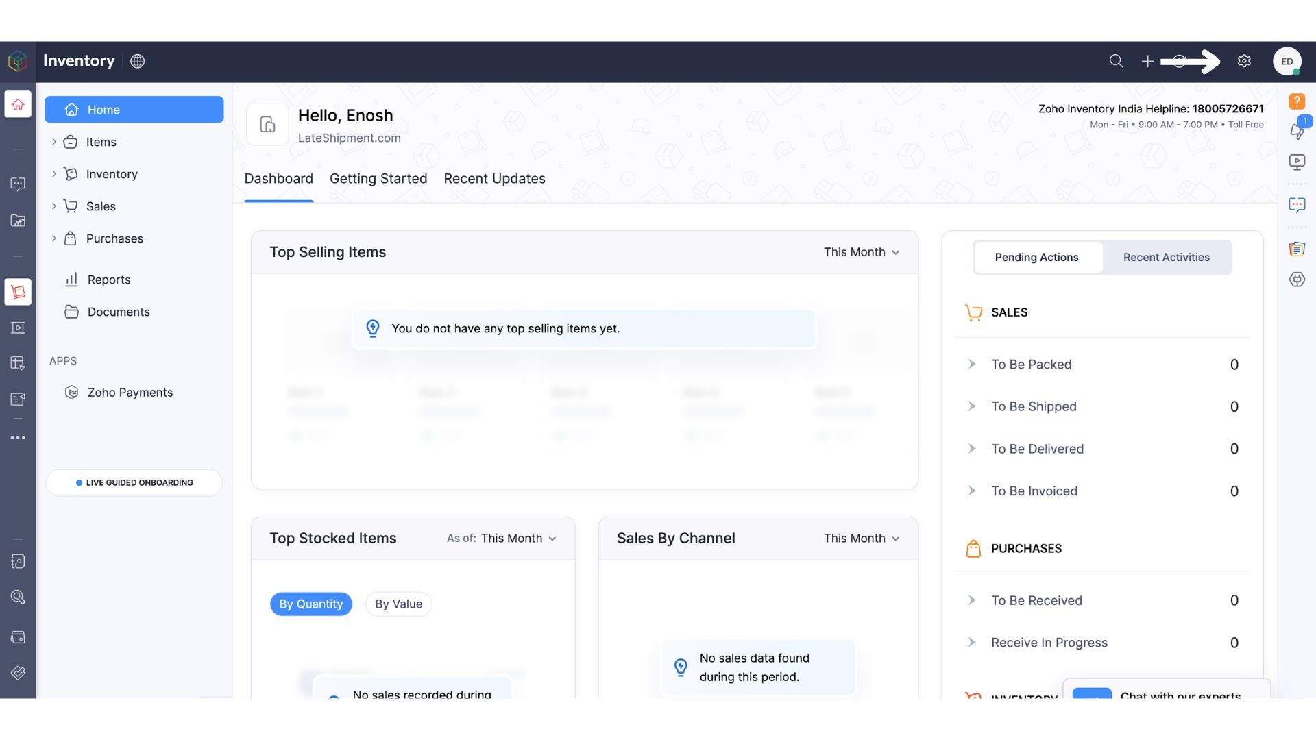 Inside Zoho Inventory, click Settings in the top-right corner.