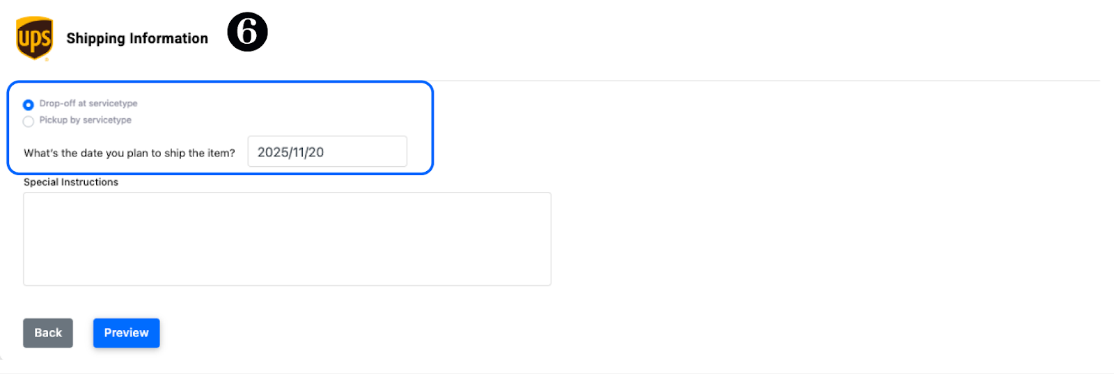 Choose a Pickup date and time, or a Drop-off location based on your shipping preference. You can also add Special Courier Instructions if needed.
