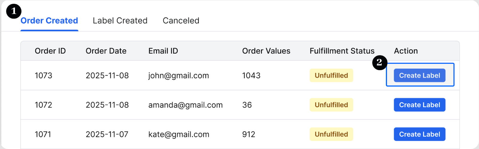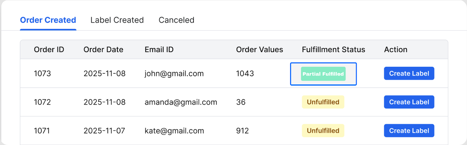 When these items become available, navigate to the Manage Label dashboard. Under the Order Created tab, locate the same Order ID and repeat the Partial Shipment process to generate new labels for any combination of the remaining items.
