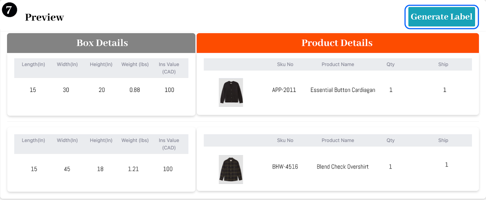 Review the products and box details, then generate the partial shipment label. Once confirmed, your label will be ready for printing.