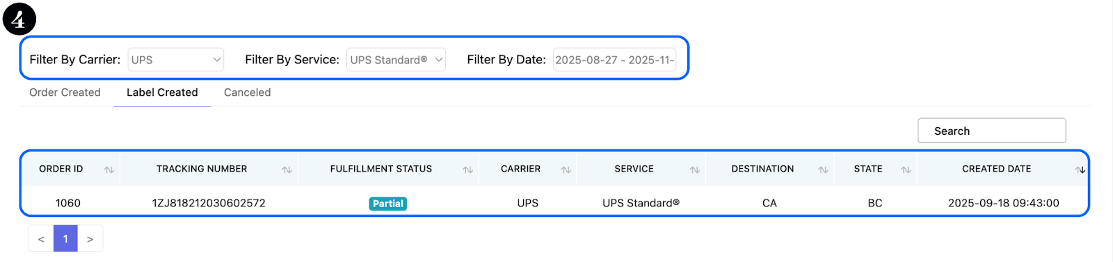 This tab serves as your central location for managing all generated labels and maintaining visibility into your shipping activity.