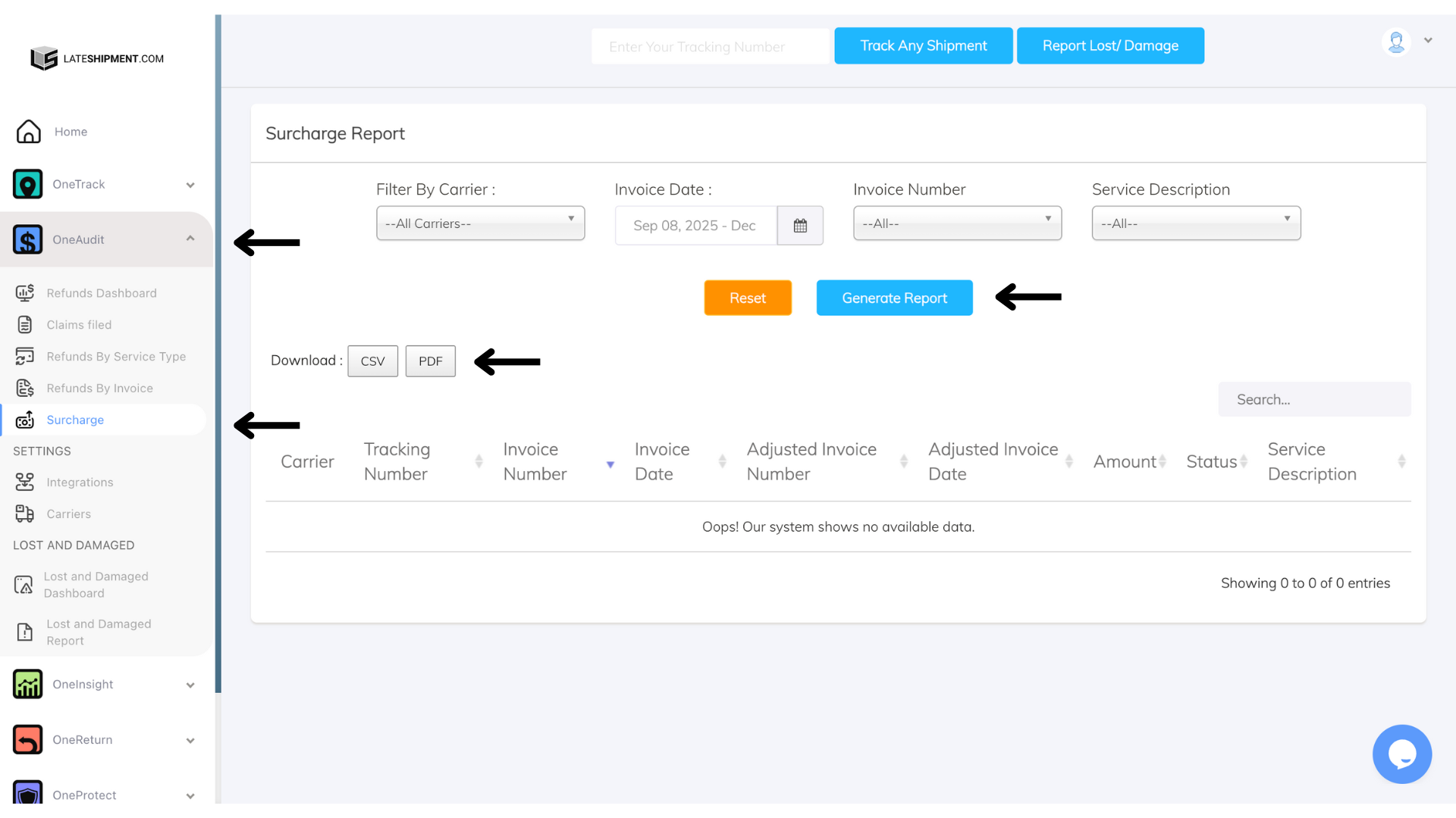 How to View and Generate the Surcharge ReportYou can easily access your Surcharge Report from the LateShipment.com dashboard. Follow the steps below to view surcharge details and generate a customized report.